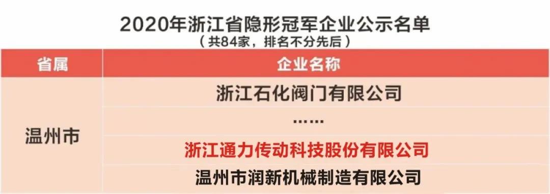 近日,浙江省經信廳正式公布了2020年浙江省“隱形冠軍”企業名單,全省共有86家企業入圍,最終84家成功獲評,通力成功上榜“隱形冠軍”企業。